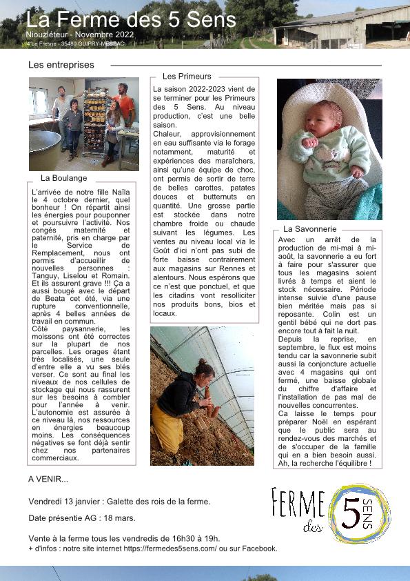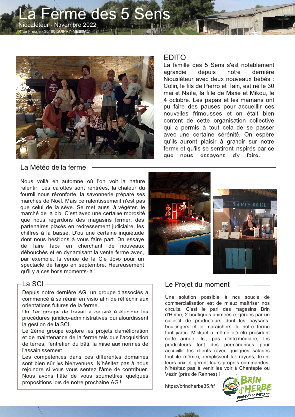 Niouzléteur de décembre Publié le 15 décembre 2022 par fermedes5sens Et voici enfin notre niouzléteur de décembre où vous allez pouvoir trouver des infos sur tout ce qui s’est passé cette année. Nos aventures, nos déboires, nos joies et nos peines. A très vite ! Partager : Cliquer pour partager sur X(ouvre dans une nouvelle fenêtre) X Cliquez pour partager sur Facebook(ouvre dans une nouvelle fenêtre) Facebook J’aime chargement…